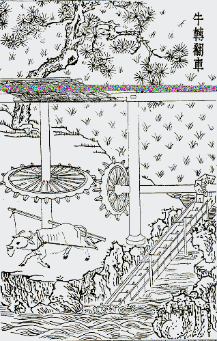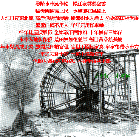 由上之言可知,水車一物在中國農業發展中實有大貢獻。它使農作所受的地形制約大為減輕,實現丘陵地和山坡地的開發。不僅用之於旱時汲水,低處積水時也可用之以排水。