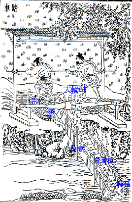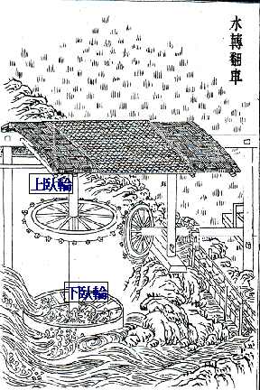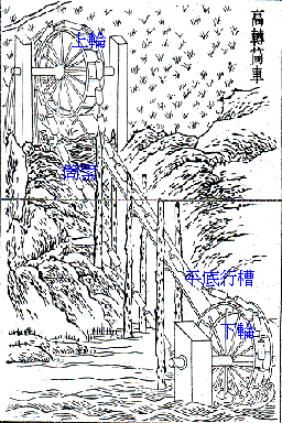 水轉翻車其制與人踏翻車俱同,但於流水岸邊掘一狹塹,置車於內。車之踏軸外端作一豎輪,豎輪之旁架木立軸,置二臥輪。其上軸適與車頭豎輪輻支相間,乃擗水旁,激下輪既轉,則上輪隨撥車頭豎輪,而翻車隨轉,倒水上岸,此是臥輪之制。若作立軸當別置,水激立輪,其輪輻之末復作小輪,輻頭稍闊,以撥車頭豎輪,此立輪之法也。然亦當視其水勢隨宜用之。其日夜不止絕勝踏車。