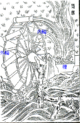 杜甫曾在詩中生動地描述了這種筒車︰「接縷垂芳餌,連筒灌小園。」還真有些詩情畫意呢﹗還有一種木桶筒車,要人用腳踏和用手牽挽。水車一轉,連接的木桶便可以連續不斷地將井水汲至地面。筒車不但功效超過了轆轤,也超過翻車的效率,在有流水的地方,利用水流的衝擊力,使筒車自行運轉,這在當時來說,已是一種較理想的「自動化」了。元代農學家王禎在提到唐朝筒車時寫道︰「水激輪轉,眾筒兜水,次第下傾於岸上,以溉稻田,日夜不息,絕勝人力……。」