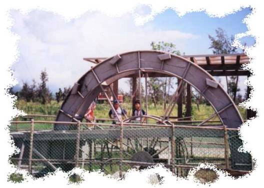 3. 上沖式水車:從水車上面沖水的方式其效率以很接近新式水車, 但落差越大,車體也變大,製造就較困難。