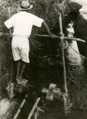 民間最早的汲水用具該是“桔槔”。《莊子.外篇.天地篇》中,載子貢南遊,反途路過漢陰時,看到一個老丈人辛苦的抱甕汲水灌溉,事倍而工半,於是告訴老翁一種省力的器具,名曰之『槔』。它的製作方式是:『鑿木為機,後重前輕,掣水若抽,數如沃湯。』也就是用一條橫木支在木架上,一端掛著汲水的木桶,一端掛著重物,像槓桿似的,可以節省汲水的力量。從抱甕灌地到桔槔汲水初步利用器械,可以說是水車發明的先軀。