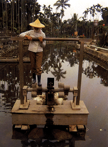 新竹草山水車(如圖12)採用人力踩踏取水,將水往高處送。
