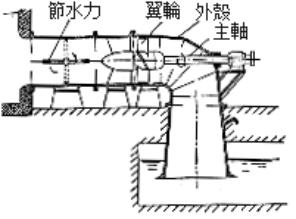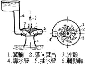 由導水管進入的水,流入外殼內,經過導向葉片衝在水車葉片上,由其作用與反作用,使水車轉動,水則由抽出管排出。(如圖14所示)