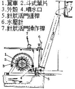 適用於高落差少水量的地方,如河川上游。其構造與佛蘭西斯水車不同,翼輪外周裝上很多斗式葉片,噴水口將水噴射在斗式葉片上,由水衝擊讓翼輪轉動。(如圖16所示)佩爾頓水車的特點如下:可用於一百公尺以上的高落差發揮高效率,即使水量減少,其效率也無顯著變化。構造簡單,易拆卸搬運及安裝。流水中含沙土,也不影響性能。可在短時間內做剎車動作,其他各型水車都無法達成。