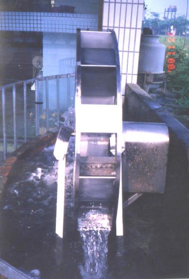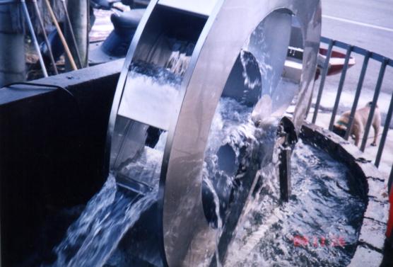 台南縣有個閹雞城為了吸引顧客,除了園中有噴水池外,在餐廳入口處就擺設了一台不鏽鋼水車,這水車以馬達帶動,直徑約一公尺,需1/4匹馬力,耗電量一天在新台幣20元以內,對其生意有相當的幫助,設計的原則也與前述幾種有所差異,各種視圖如圖19至21所示,在槽內水是不流動的,主要是要讓水在高處及環內射出形成水花及射流。假如槽內的水是流動的時候(如灌溉引水狀況),則可不需要馬達帶動即可運轉,因此用於抬高水位灌溉之水車設計應考慮水流衝力(如束縮水流增加流速)及力距平衡(利用槓桿原理)、取水落差、滾輪摩擦力、水車自重(採輕質材料如鋁合金、汰合金等)、水力及能量損失(衝擊角度)、靜水池、攔污柵、取水筒形狀角度及可人力手動操作等設計等因素,由圖中可以看出它設計在水車半徑高度處讓水射流出來,將來用於低處取水時可以考慮改用筒車的方式讓水由頂端流出,這樣可以增加抬高的揚程,也是設計考慮的重點之一。